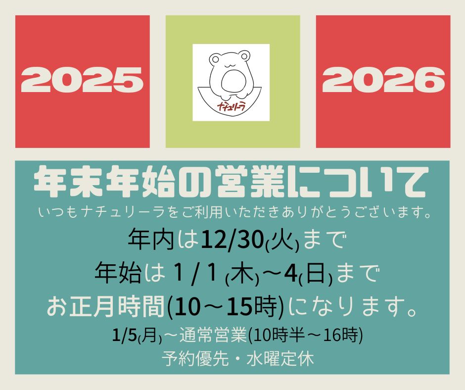 大晦日が水曜なのでナチュリーラは定休日。よって年内は30日まで(カラダメンテは29日まで)。