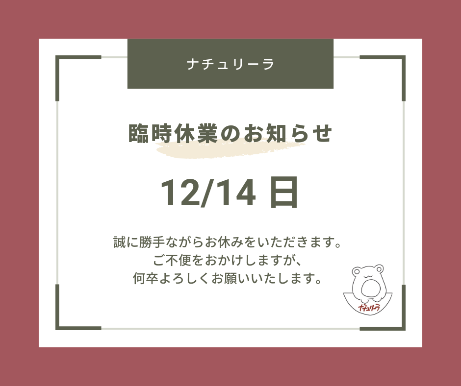 こんにちは。本日12/14(日)ナチュリーラは臨時休業させていただきます。